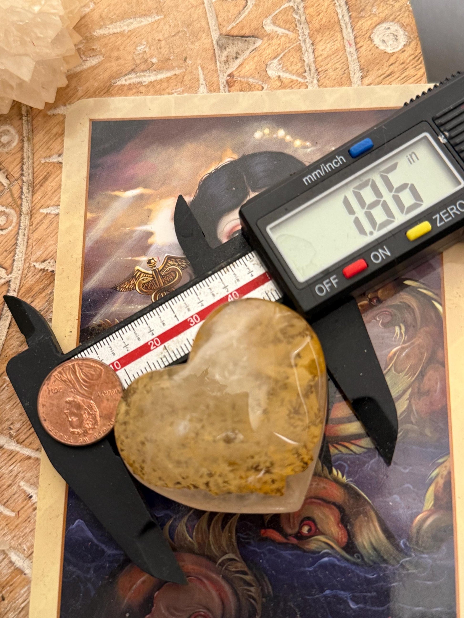 Precious Dendritic Quartz heart with golden healer inclusions. Perfect gift for a loved one. Small size, under two inches. *Disclaimer* Natural blemish mark on its face.