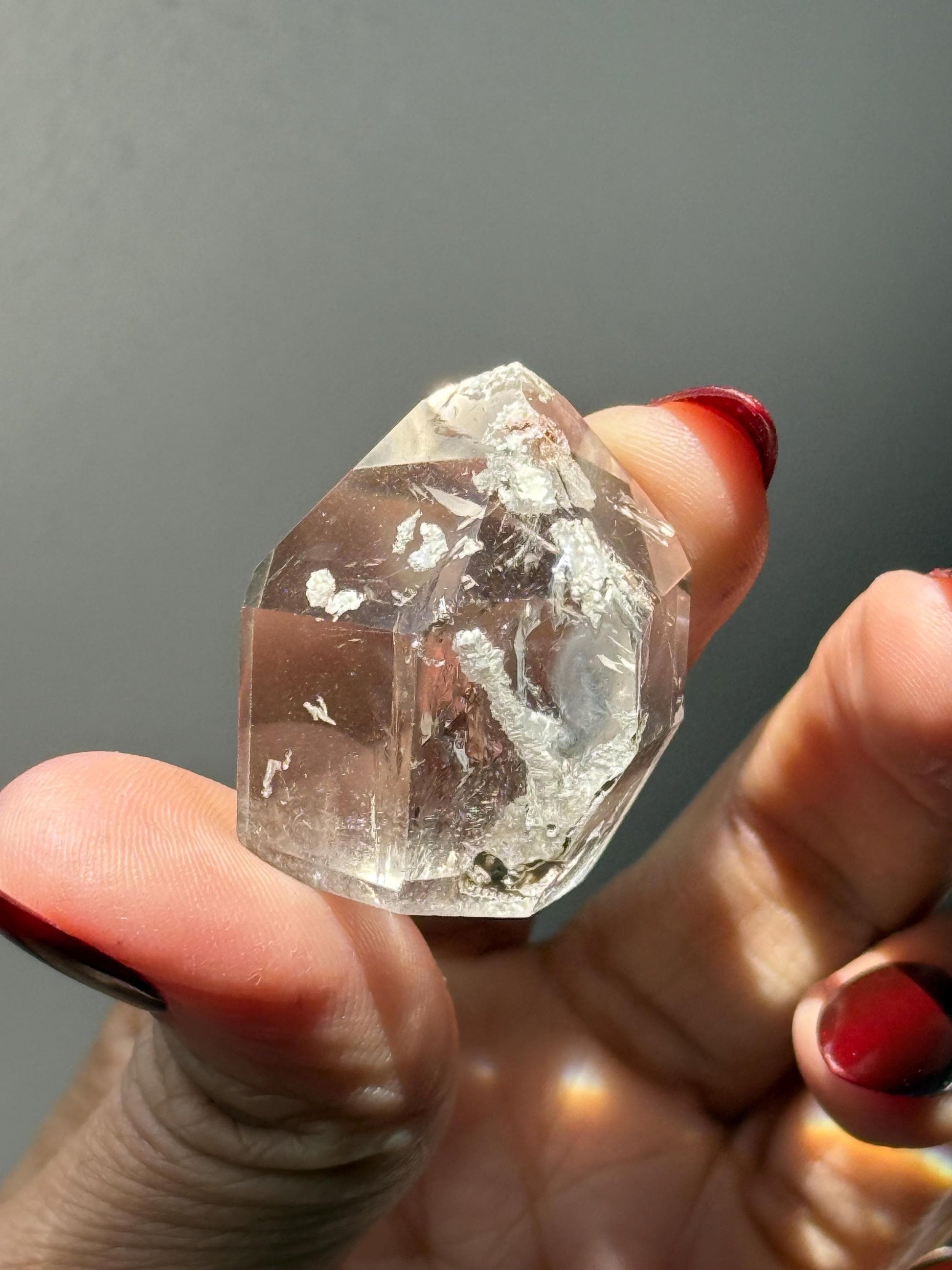 Adorable, super small Lumerian quartz , high grade with small lodolite ( garden quartz) inclusions. I am very small but thick!