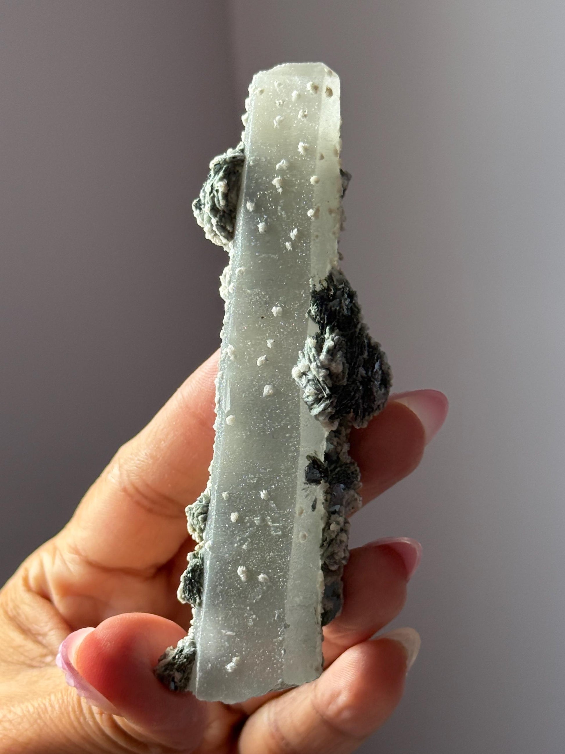 Witches finger -- it a natural raw specimen, similar to 'spirit Quartz', only this natural raw crystal has inclusions such as Hematite, manganese and UV-Reactive Calcite Inclusions. Lots of Sparkle! A unique piece for mineral collectors and geology enthusiasts who appreciate naturally complex mineral associations.